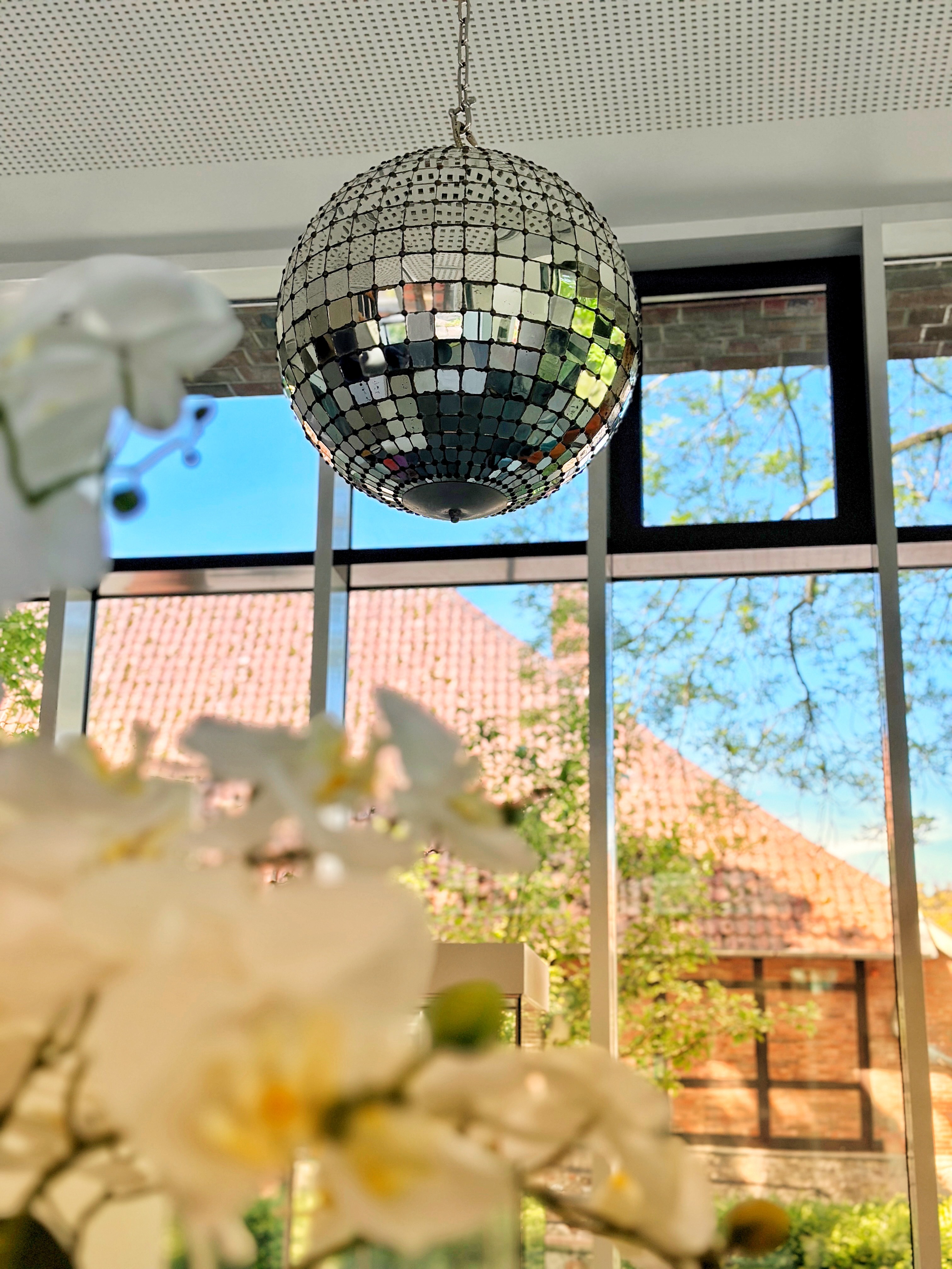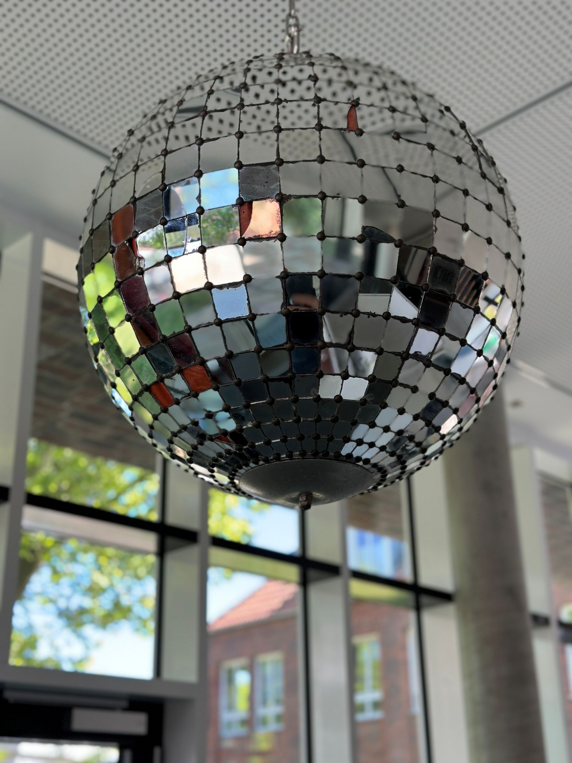 „Ich freue mich sehr, dass die HEH Essmann Stiftung uns einen so wertvollen Schatz der Lingener Gastronomiegeschichte und Festkultur als ewige Leihgabe zur Verfügung gestellt hat“, schwärmt Dr. Christof Spannhoff, Leiter des Emslandmuseums Lingen, über die historische Spiegelkugel von der Wilhelmshöhe, die sich seit Anfang 2025 in der Sammlung der Geschichtsinstitution befindet und seit Mai im Foyer zu bewundern ist. Die mit kleinen Glasspiegeln bestückte Kugel wurde bereits 1929 angeschafft, als der Saal des beliebten Ausflugsziels renoviert wurde. „Das war damals etwas ganz Neues“, so Spannhoff. „Spiegelkugeln kamen überhaupt erst in den 1920er Jahren in Berlin auf und wurden dort zunächst in den Tanzpalästen installiert. Als Erfinder gilt Paul Baatz, Chef des Tanzpalasts Residenz-Casino, in dem er auch andere technische Neuheiten wie Tischtelefone oder Rohrpost einführte. Überregional bekannt und beliebt wurden die strahlenden Globen dann durch die damaligen Filme wie Berlin: Die Sinfonie der Großstadt (1927) oder Der blaue Engel (1929/30), in denen sie zu sehen waren.“ Dass auch Lingen bereits Ende der 1920er Jahre eine Spiegelkugel bekam, hing mit dem Innovationen sehr aufgeschlossenen Pächter Heinrich Essmann zusammen, der auch 1930 eine große Gastronomie-Ausstellung in dem seit 1845 bestehenden Gaststättenbetrieb initiierte.